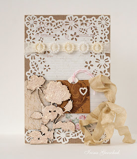 Детальки: Вся бумага MF,штамп, пуговки,глиттер ТХ, вощеный шнур,шебби-лента, страз, винтажный цветочек, перо, чипборд-рамочка (акрил+кракелюр+сухой глиттер), полужемчуг, эмбоссинг (белой и прозрачной пудрой), немного миста, машинная строчка.